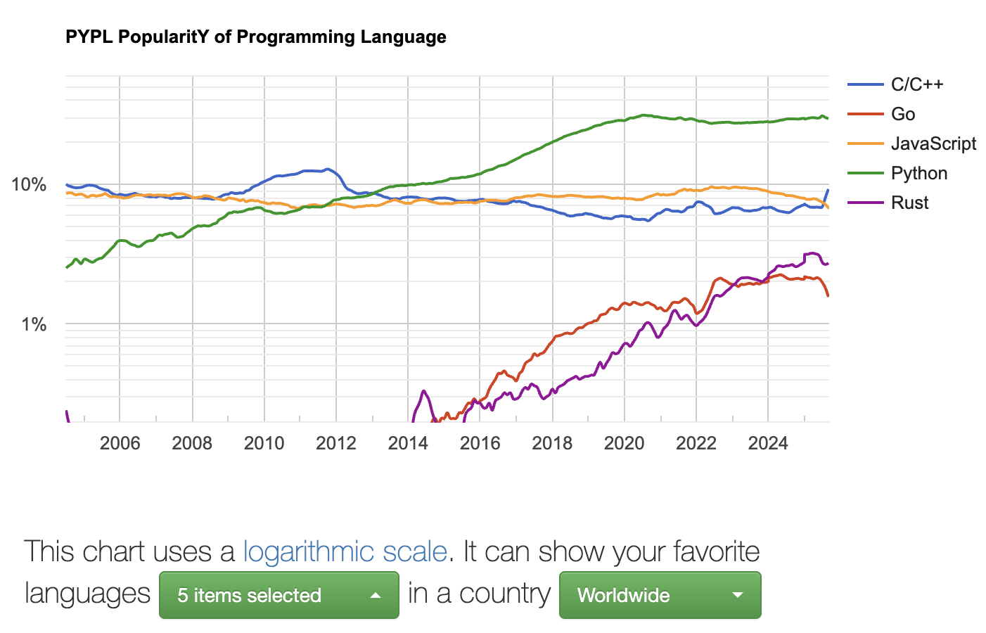 As you can see, the language has grown in an unrivaled manner. First a big surge in 2004, and then exponential growth since the mid-2010s.
